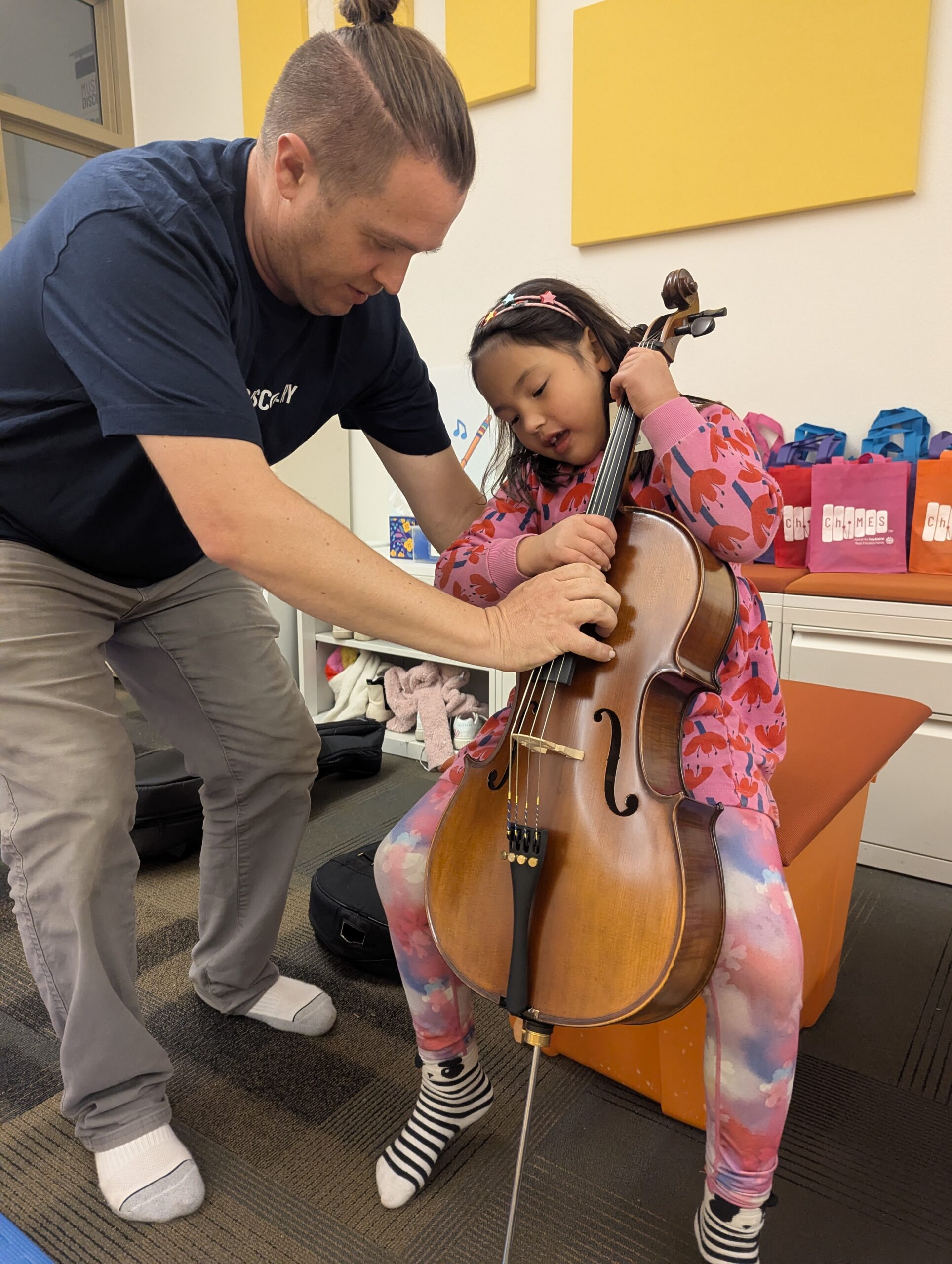 In the second year of Music Discovery, students are introduced to the families of instruments in the orchestra, and receive hands-on instruction as they learn how to hold, care for, and play string instruments (including the violin and cello), and wind and brass instruments (introductory Nuvo instruments including the toot, dood, and J-horn).